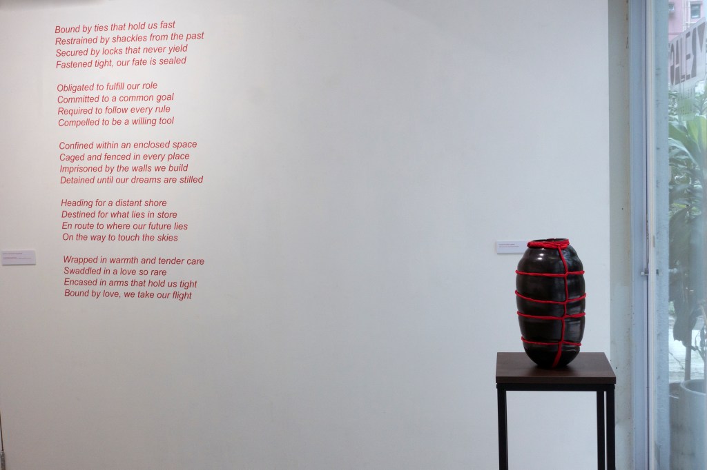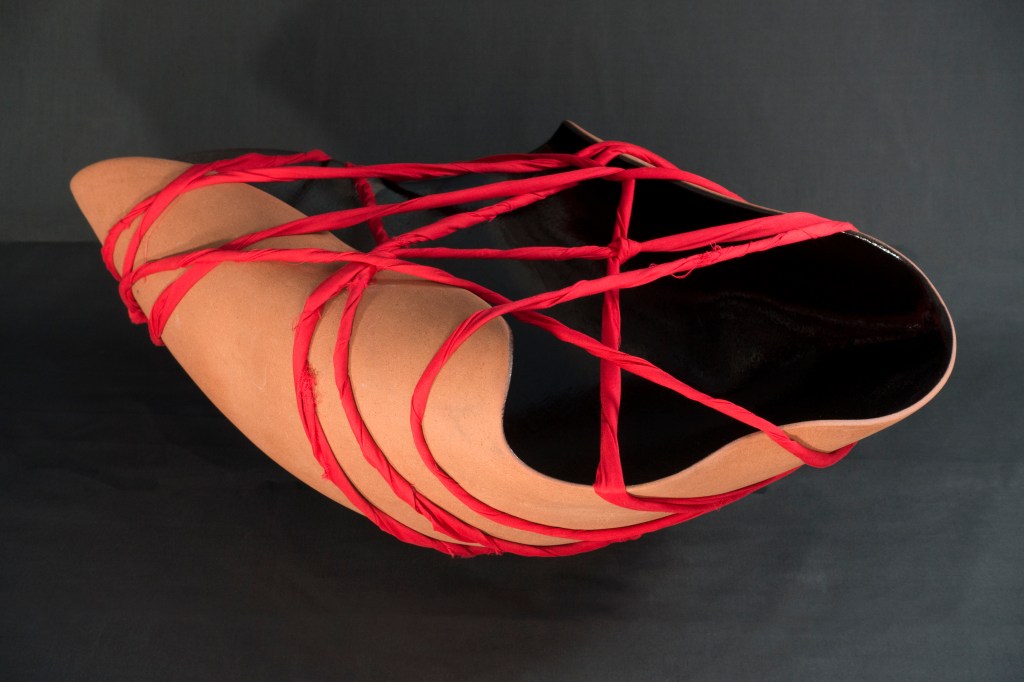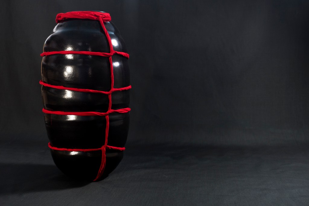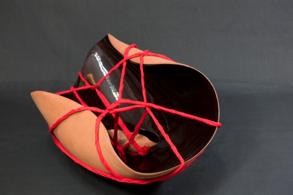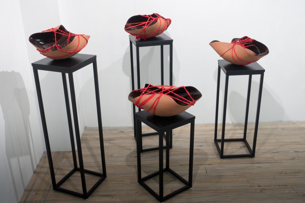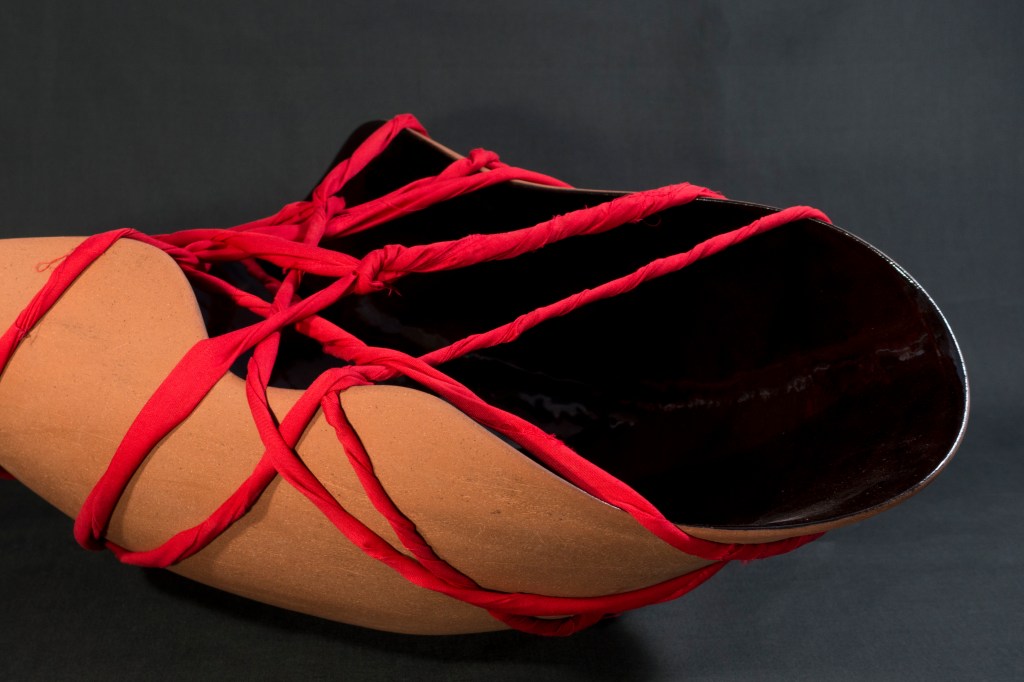 Red clay vessels, made on the potter’s wheel are transformed through squeezing and excising before being tied tight with twisted red fabric strips. A dark, but not black, glossy interior simultaneously absorbs and reflects the ambient lighting, while the exteriors are mostly unglazed, showing the scratch marks and scuffing of their formation like a hardened weathered skin. Their rims are partially folding inwards, perhaps shielding the contents, like a comforting embrace or maybe self-protection from external ills.